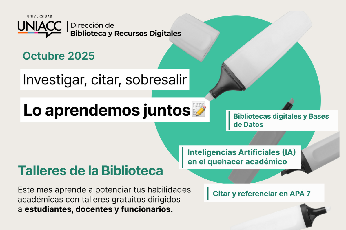 Este mes te invitamos a participar en los talleres gratuitos de la Biblioteca UNIACC, diseñados para fortalecer tus habilidades académicas y acompañarte en tu proceso formativo. 👉 Novedad: por primera vez estrenamos el taller de Inteligencias Artificiales (IA) en el quehacer académico, que se suma a nuestras clásicas instancias de Bases de Datos y APA 7. 📘 Bibliotecas digitales y Bases de DatosExploraremos […]